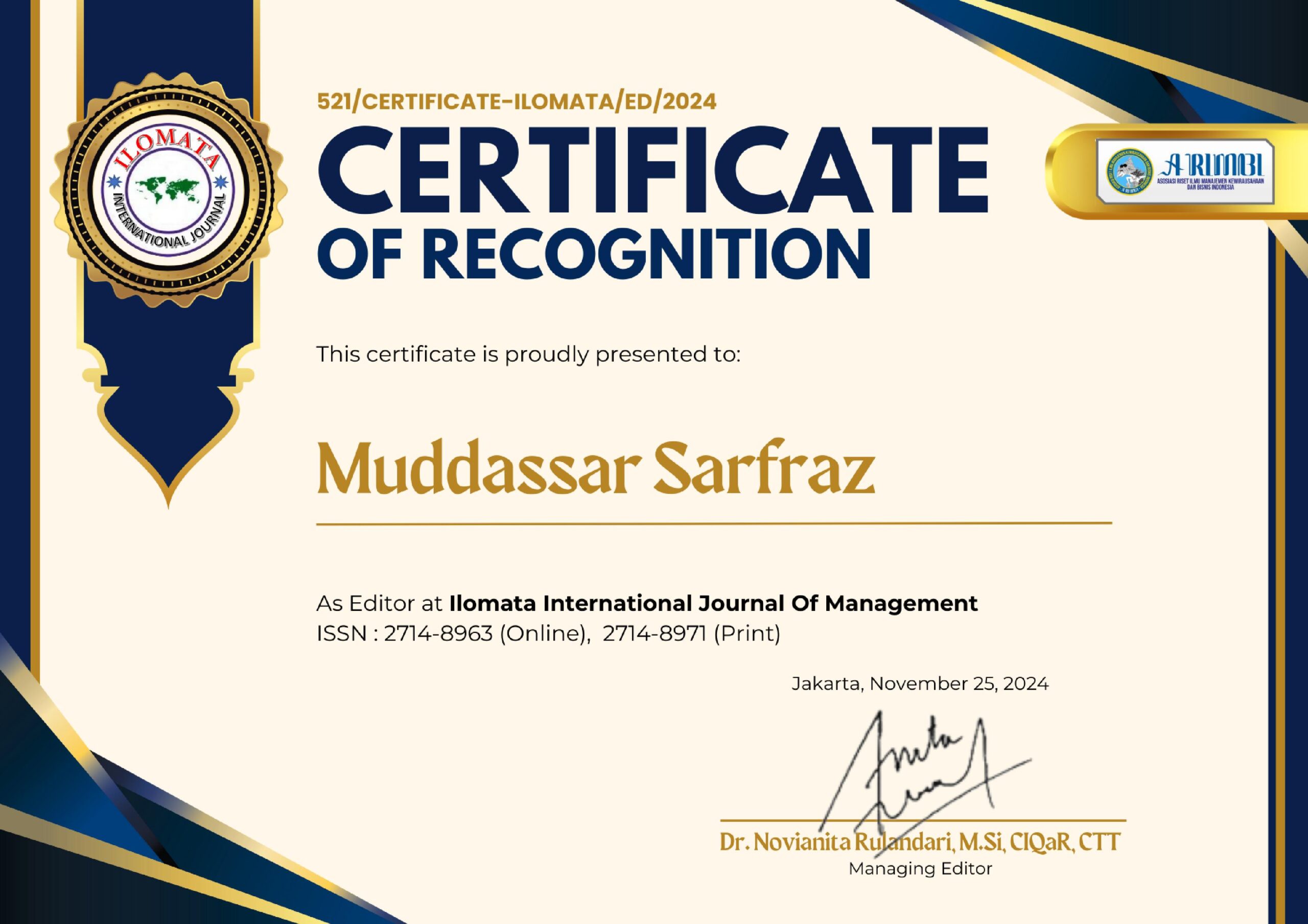 Excellent Student of the Year IMBA program, SEBA